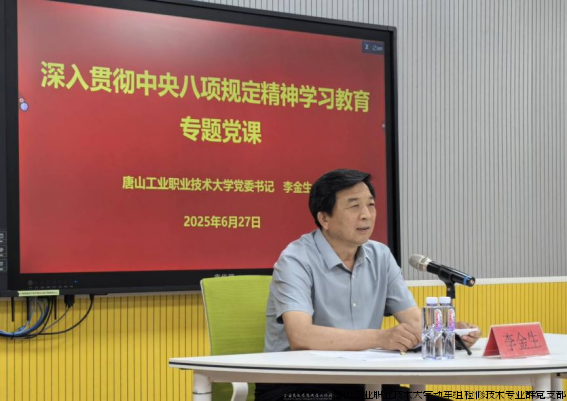 为深入学习贯彻习近平总书记关于加强党的作风建设的重要论述,推动基层党组织作风建设走深走实,6月27日,唐山工业职业技术大学党委书记李金生走进自动化工程学院,为学院教师讲授“深入贯彻中央八项规定精神学习教育”专题党课。自动化工程学院领导班子成员、全体教师参加学习。