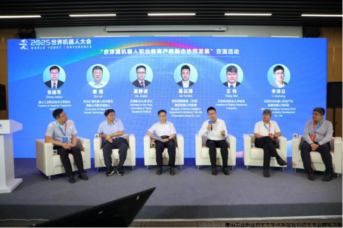 在圆桌会议环节,唐山工业职业技术大学校长张建军、北京科技职业大学校长王伟、天津职业大学书记夏静波,北京亦庄机器人科技产业发展有限公司经理李泽众、肯拓智能装备(天津)集团有限公司经理葛云涛、河北汇博科技有限公司董事长秦磊等六位职业院校和企业代表就围绕“产教融合如何精准对接产业需求”、“机器人人才培养模式创新”等议题展开深入对话。各位代表一致认为,深化京津冀机器人领域产教融合需构建协同育人新生态,通过建立课程内容与产业技术动态对接机制,推动人才培养标准与前沿岗位需求深度契合;依托跨区域资源共建共享平台,实现实训场景与产业实践的创新融合;构建政校企协同联动体系,促进教育供给与产业升级双向赋能,形成教育链、人才链、产业链有机衔接的发展格局,全面提升技术技能人才培养质量,为京津冀协同发展培育新质生产力,合力打造具有全国示范意义的产教融合创新高地。