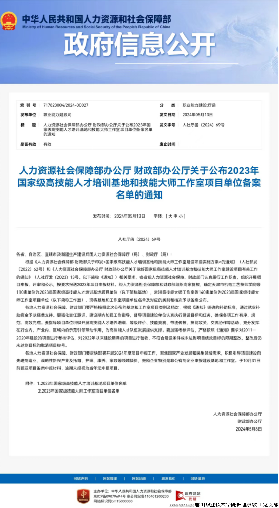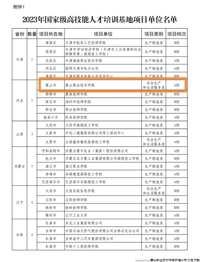 近日,人力资源社会保障部办公厅、财政部办公厅印发《关于公布2023年国家级高技能人才培训基地和技能大师工作室项目单位备案名单的通知》,唐山职业技术学院被确定为2023年国家级高技能人才培训基地项目单位。培训工种为养老护理员、保育师、健康管理师、健康照护师、保健按摩师。