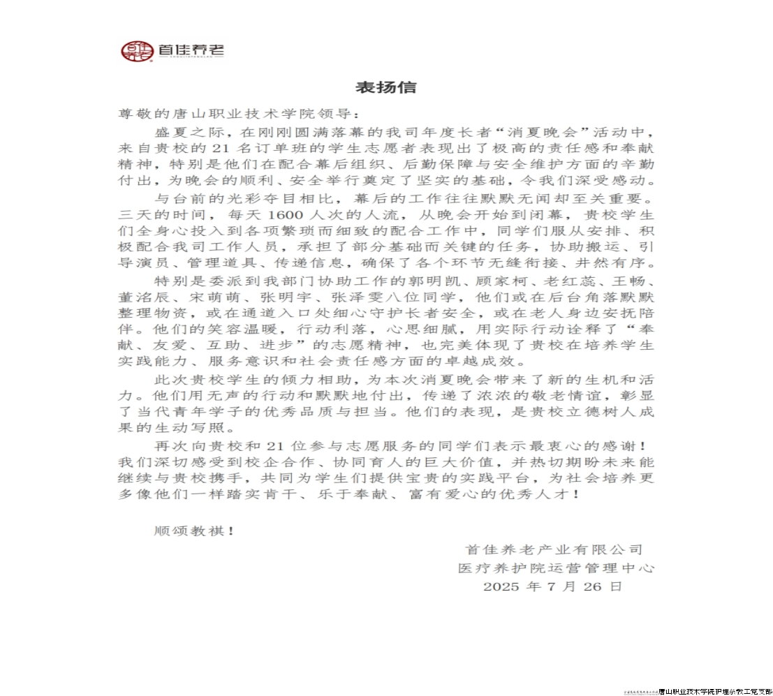 作为全国党建工作样板支部,唐山职业技术学院护理系教工党支部始终将“立德树人”作为根本任务,在人才培养中深耕实践育人与志愿服务精神培育。在首佳养老年度长者 “消夏晚会”中,护理系21名订单班学生志愿者以卓越表现赢得赞誉,首佳养老特致信表扬,既是对学子们的肯定,更是对支部育人成果的生动印证。
