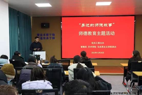 躬耕教坛,强国有我。为深入学习贯彻党的二十大精神,落实新时代教师行为十项准则,搭建青年教师交流展示新平台。12月27日,由校关工委主办、人工智能与大数据学院、艺术学院、马克思主义学院联合开展的“身边的师德故事”师德教育主题活动在智数院107会议室举行。校关工委副主任郭冬梅、智数院关工委副主任胡利胜、智数院党总支书记段艳艳、艺术院党总支书记谢华永、直属马克思主义学院党支部书记钟庆文,以及三个学院的青年教师们参加了活动。