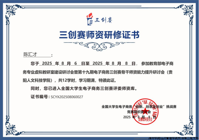 为进一步提高教育部电子商务专业虚拟教研室建设的水平,进一步提高全国大学生电子商务“创新、创意及创业”挑战赛(简称三创赛)指导老师、比赛评委以及校赛、省级赛和国赛竞组委对三创赛规则和体系的了解、把握和能力提高,总结15届三创赛以来的经验和成果,为全国电子商务类专业、课程、科研、实践教学和大赛等服务。2025年8月6日--2025年8月8日在贵阳人文科技学院举办“教育部电子商务专业虚拟教研室建设研讨会暨第十九期电子商务三创赛骨干师资能力提升研讨会”(简称“双研会”)。经济管理学院国际经济与贸易系主任、教师第二党支部书记陈汇才应邀参加了会议。
