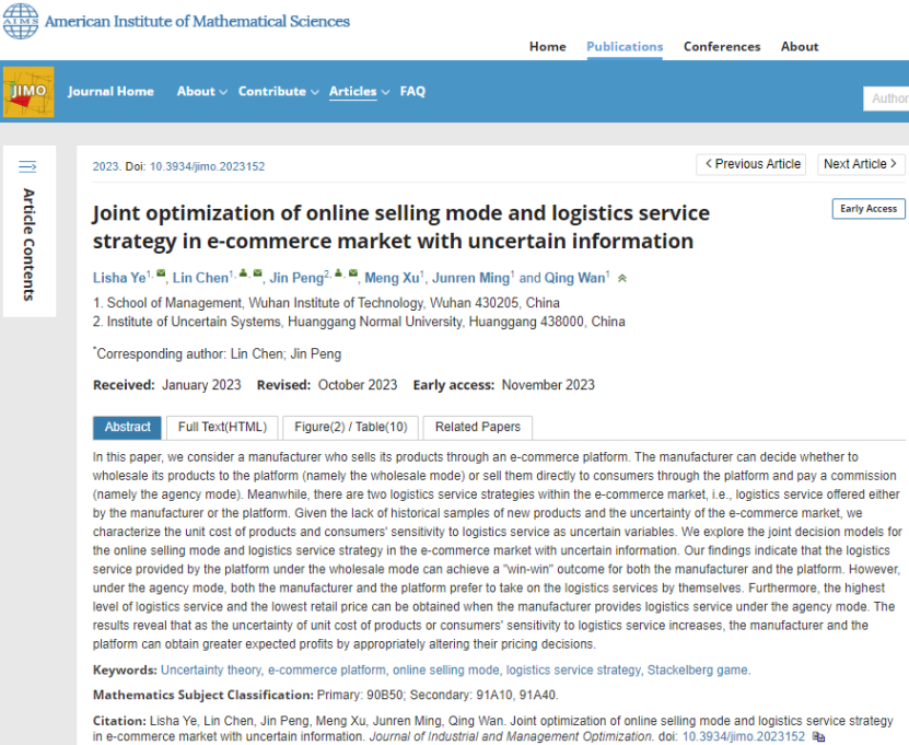 近日,管理学院管理科学与工程系2020级信息管理与信息系统专业本科生叶丽莎同学在学业导师陈林博士的指导下以第一作者身份在SCI期刊《Journal of Industrial and Management Optimization》发表题为“Joint Optimization of Online Selling Mode and Logistics Service Strategy in E-commerce Market with Uncertain Information”的学术论文。管科系本科生在SCI期刊上发表学术论文,是我院本科生导师制取得的又一新成绩。