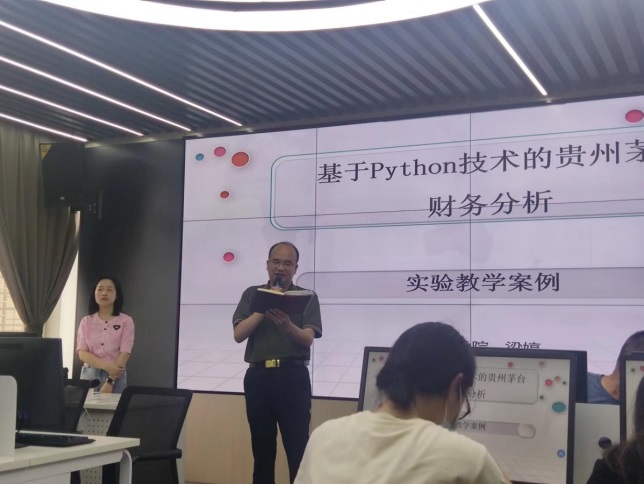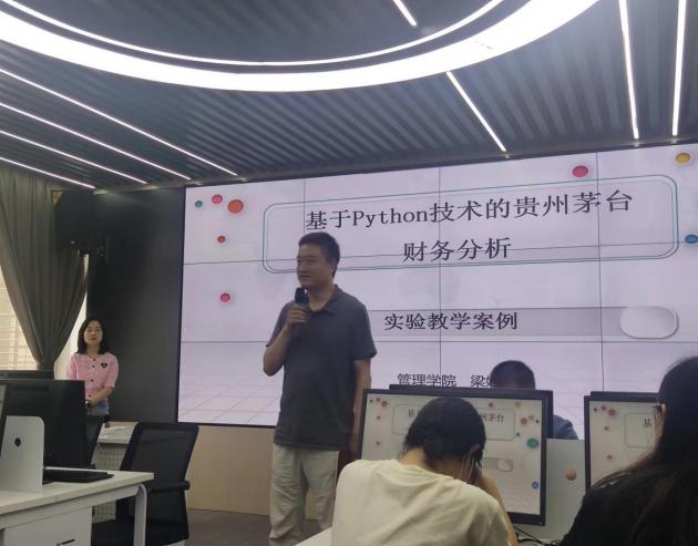 在实验楼205,经管实验中心毛主任主持及组织下,审计学专业的系主任梁婷副教授,高规格的课堂很快就吸引了众多老师的眼球,会计系等几位刚刚入职的新老师也早早等候,更有几位有监考任务的老师也不愿错过开讲前的花絮。课程开始,梁婷老师的示范课直接切入热点话题,课程名称是《基于这Python技术的贵州茅台财务分析实验教学案例》。近些年Python技术的讨论十分普遍,广泛应用于各行业和领域,老师们感觉既熟悉又陌生,梁老师声音宏亮又娓娓道来的介绍了什么是Python,如何加入Python和如何融入Python三个话题作为引导,后面用贵州茅台作为案例,分享了她从入门到应用实验教学的体会和感受。