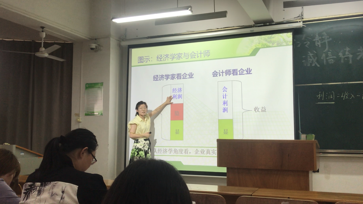 另一示范课堂设置在综合楼607,来自工商管理系张丹丹副教授为大家展示了《经济学》的部分内容。她清新、知性着装,干净凝练的语言、抑扬顿挫的语调,课程设计极显匠心。课堂由案例《鸡场主的经济学》,有趣的故事一起回顾了成本、利润及利润公式,导出本章节学习目标,之后设计了学生熟识的电视剧《武林外传》中人物及场景《吕秀才开店》导入,开始学习显性成本及隐性成本, 引导学生认知会计成本及利润与经济学意义的成本及利润的区别。以身边常见小事件使学生明确沉默成本概念,并引导学生在面对沉默成本问题时如何做决策。随后,以一课堂作业反馈学生学习掌握情况,结课小结别开生面以品味恋爱中的成本,一方面引导学生认知机会成本、显性成本、隐性成本、经济利润、以及沉没成本,同时对学生进行思政元素融入:面对恋爱分手时的沉没成本应懂得放弃沉没成本是最优选择。各位参加课程观摩老师感受到课堂设计的精心,体会了当回学生的幸福感,感觉时间飞逝、一堂课结束还意犹未尽。课后张老师与观摩老师进行了课程教学的探讨和交流,部分老师因为监考未能出席课堂表示遗憾,管理学院将录制课程上传云端方便老师们线上学习观摩。