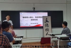 9月25日下午,我院在玉成楼605隆重举行了“赓续育人初心,传承师道力量”师德传承主题活动。学院领导及全体教职工齐聚一堂,安全科学与工程系党支部全体教师共同见证了一场庄严而温馨的师德传承仪式。