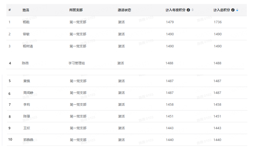 (通讯员 陈薇)人文学院教工第一党支部整体学习态势良好,支部党员学习积极性高,人均积分有较大增幅。六月份,一支部活跃学员29人,学习强国月平均参与率100%,学员月最高得分1736分。六月积分排前十名党员分别是:杨戟、曾敏、杨树清、陈薇、黄慎、周闻峥、李莉、陈璟、王欣、郭晶晶。现对以上同志进行通报表扬,希望其他党员同志向学习积极分子看齐,努力学习,力争上游,自觉养成良好的学习习惯,形成“比、学、赶、帮、超”的良好氛围。希望全体党员进一步提高政治站位,提高对习近平新时代中国特色社会主义思想重要性的认识,把平台作为日常学习互相交流的重要途径,经常学习、深入学习、联系实际学习,入脑入心,做到学有所获,学有所悟,学以致用,自觉强化理论武装头脑,自觉增强“四个意识”,坚定“四个自信”,做到“两个维护”。