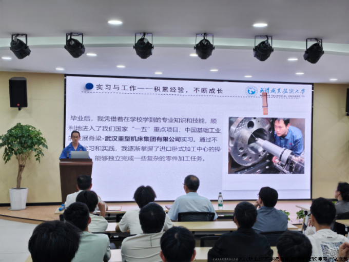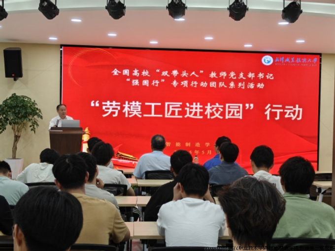 新闻网讯(通讯员 张旭)5月22日,武汉职业技术大学智能制造学院迎来一场别开生面的匠心传承课。作为全国高校党建工作样板支部培育单位,智能制造学院教师第一党支部精心策划的全国高校“双带头人”教师党支部书记“强国行”专项行动系列活动之"劳模工匠进校园"主题活动如期举行。湖北省首席技师、荆楚工匠、武重集团精密镗工技能带头人、2007级优秀校友刘永清重返母校,向75名师生代表分享其16 载"精工铸剑"之路。
