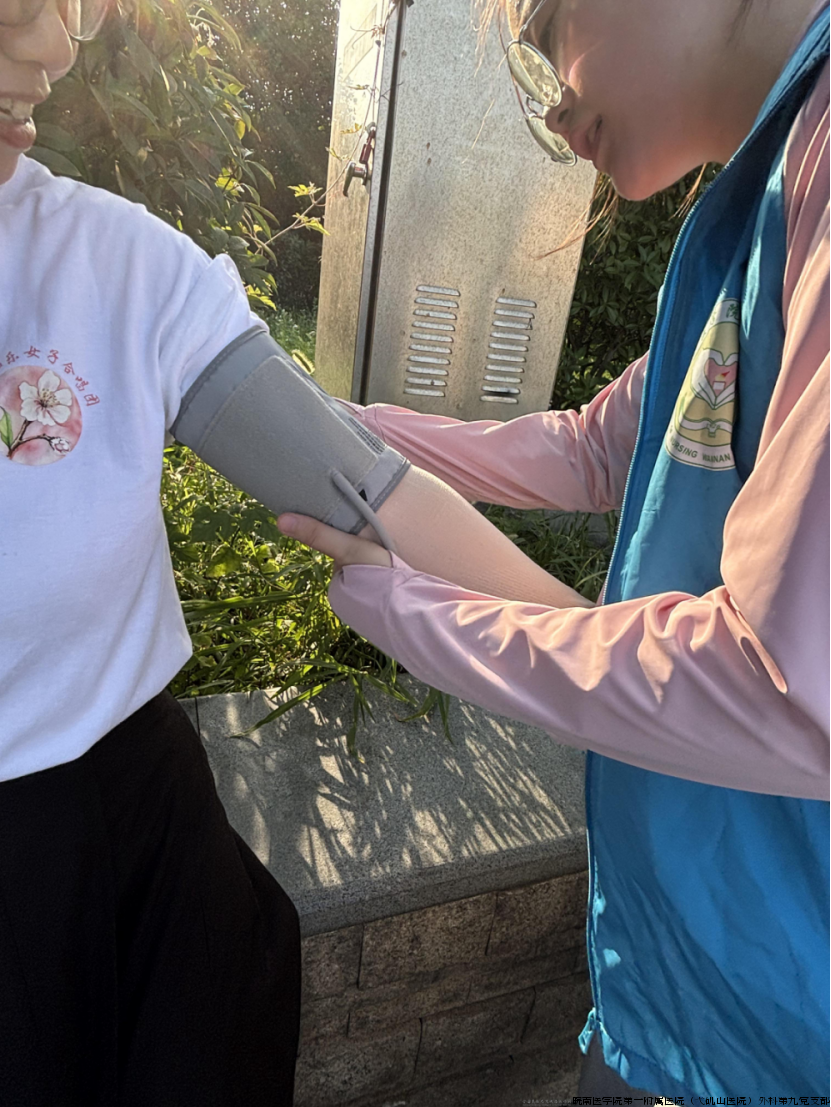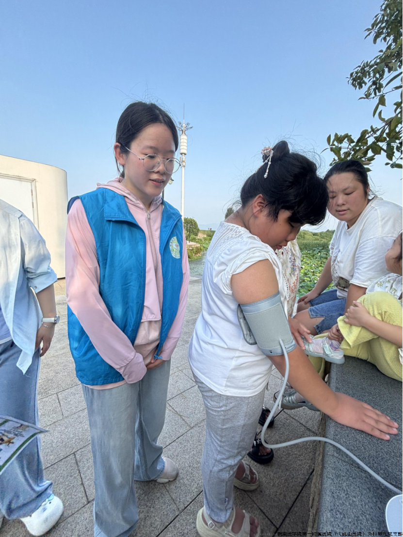 广场一侧,三张折叠桌拼成简易“健康驿站”,血压计、血糖仪一字排开。队员们统一身着天蓝色队服,一边擦拭额头的汗水,一边为络绎不绝的市民免费检测。“收缩压146,阿姨您先别着急,咱们再复测一次。”队长陶洁话音未落,队员蔺婷婷已递上矿泉水和湿巾。短短2小时,志愿者们完成血压、血糖初筛约100人次,建立纸质健康档案50份,线上小程序同步录入,方便后续跟进。
