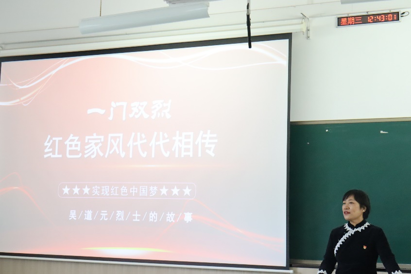 党课中,吴烈云从爷爷吴道元的抗战故事切入。她说,抗战爆发后,她的爷爷吴道元投身革命,筹集物资,英勇抗敌,屡建奇功;外公郭善尧(郭忠)受吴道元引导,也一同加入武工队,潜入敌营搜集情报。两人并肩作战,打击反动势力。然而在一次执行任务时,郭忠不幸牺牲,不久后吴道元也英勇就义。父亲吴剑彪继承了爷爷的遗志,成为革命军人,从事航空航天事业;母亲郭金娣则成为教师。吴烈云还提到,她的父母退休后,为了让后代铭记革命历史,两位老人多方查资料、找档案、寻访见证人,二老一个口述一个执笔,一字一句将烈士光荣事迹整理编印,完成了“红色家谱”——《我的前七十年》。