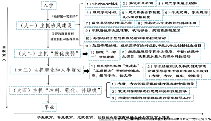 大四主抓“冲刺、强化和补短板”,对班级同学实施分类引导。对于考研、考公的同学要跟踪关注其思想动态、鼓励其坚持到底,并实时给出专业建议;对于就业的同学,帮助其分析就业形势、就业选择,并指导其提前学习产业实用技能,强化自己的就业竞争力;对毕业有困难的同学则开展学业帮扶,帮助其顺利毕业并及时就业。