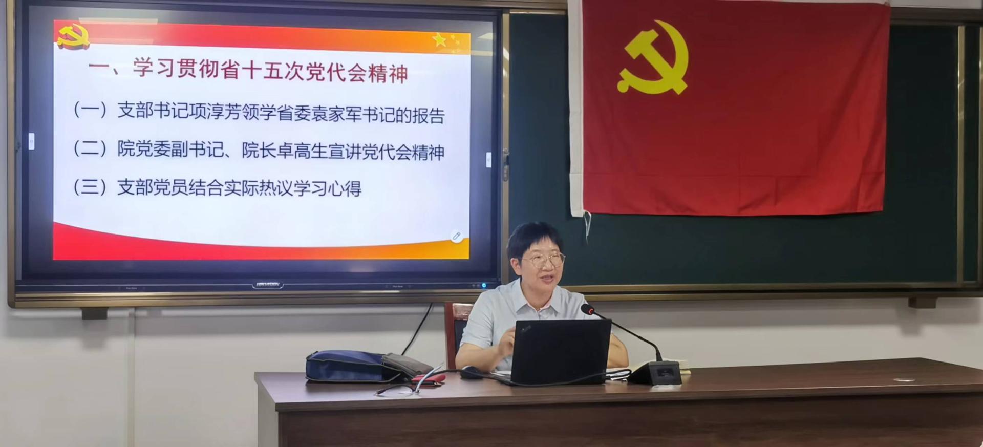 支部书记项淳芳领学省第十五次党代会报告。党员们对照省第十五次党代会《忠实践行“八八战略” 坚决做到“两个维护” 在高质量发展中奋力推进中国特色社会主义共同富裕先行和省域现代化先行》的报告全文认真学习,并结合张振丰市长向温大师生所作的省第十五次党代会精神宣讲,重点围绕本次党代会的主题、里程碑意义、浙江省推进“两个先行”的自信底气(“9个这五年”的历史经验)、指路明灯(“5大战略指引”和“11方面重要遵循”)、具体目标(“打造8个高地”)、战略举措(“5大工作导向”和“10个着力”)等进行学思悟践,强调要结合工作实际,把自己摆进去,在原原本本、原汁原味学中做到内化于心、外化于行,以钉钉子精神推动省党代会精神落实落地。