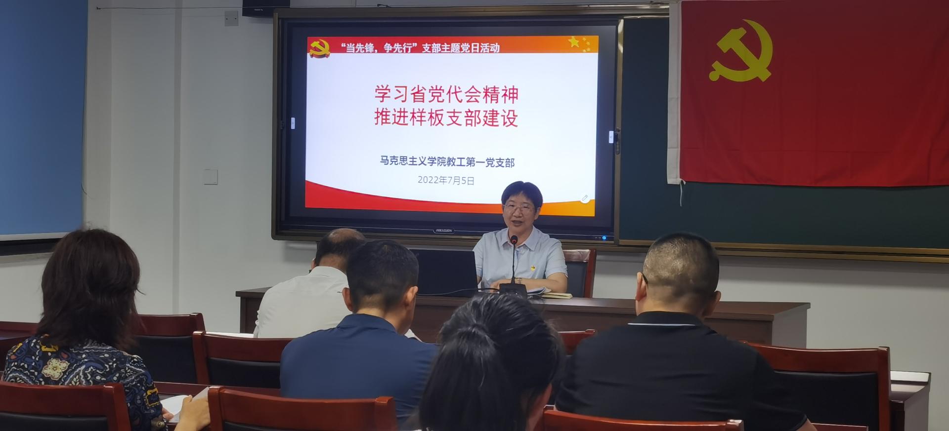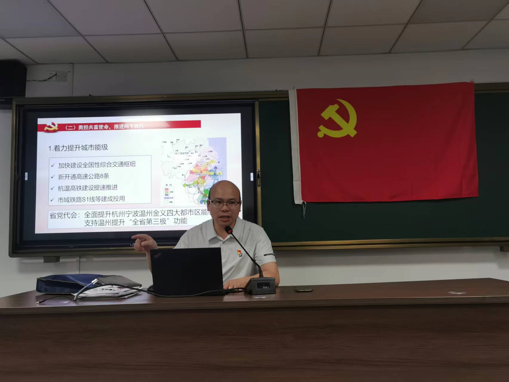 为深入学习贯彻省党代会精神和响应温州市委组织部《关于以“奋进‘两个先行’ 当好开路先锋”为主题深入开展“红七月·服务月”活动的通知》《关于以“当先锋、争先行”为主题集中开展支部主题党日活动的通知》的要求,温州大学马克思主义学院教工第一党支部于7月5日在浙江省委党校平阳分校教学楼202教室召开“学习省党代会精神 推进样板支部建设”支部党员大会暨“当先锋,争先行”主题党日活动,会议由支部书记项淳芳同志主持。