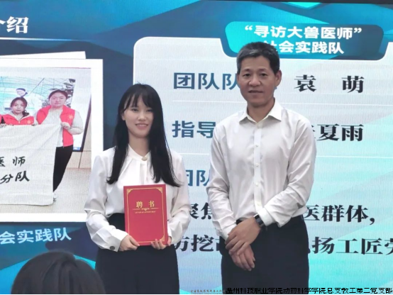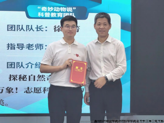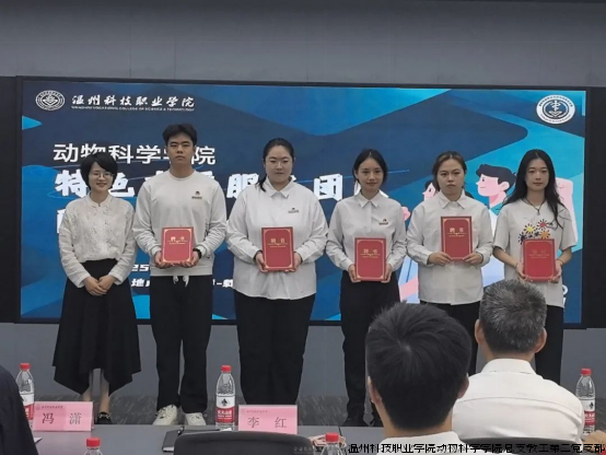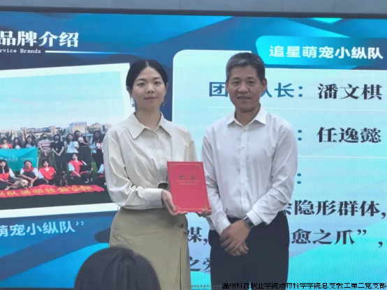 在聘任环节,陈旭辉副书记为姜斌、许红喜等5位专业教师颁发导师聘书。导师们将凭借自己深厚的专业知识和丰富的实践经验,成为志愿服务团队的“智囊团”和“引路人”,带领学生深入田间地头、社区基层,在动物疫病防治、养殖技术推广等实践中开展科技助农服务。