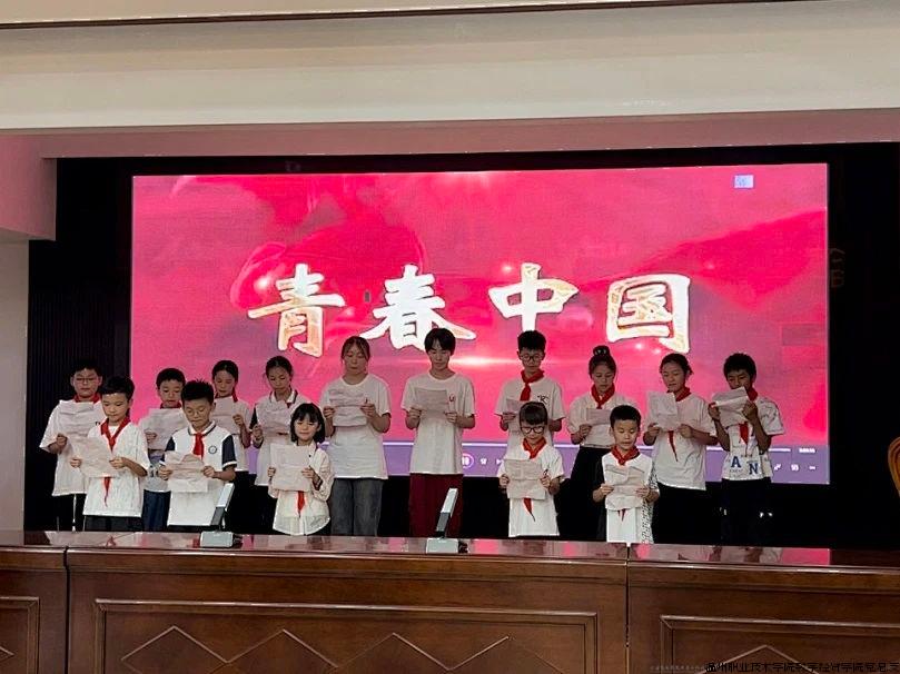 活动第五项:由实践队队员徐笙栋、吴家丽小老师带着他们的小学生们共同朗诵《青春中国》,他们的朗诵充满了激情,展现了青春的活力和希望,也让在场的观众感受到了他们对国家的热爱和责任感。这次活动不仅展示了小学生们的才艺,也让他们更加深入地理解了青春和国家的意义,激发了他们的爱国热情和社会责任感。