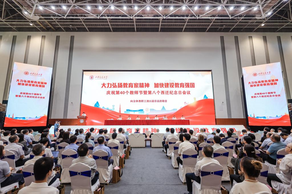 秋风送爽桂花香,盛世丰歌四海扬。9月14日下午,西安交通大学庆祝第40个教师节暨第八个西迁纪念日会议在思源学生活动中心举行。西安交大党委书记卢建军,校长、中国工程院院士张立群,中国科学院院士姚熹,中国工程院院士郑南宁,中国科学院院士徐宗本、何雅玲、管晓宏、郭烈锦,退出领导岗位的老领导,西迁老教授代表,在校校领导,在教学、科研、医疗、管理服务和后勤保障等岗位上的教职工代表,共计2000余人参加会议。会议由党委常委、副校长严俊杰主持。