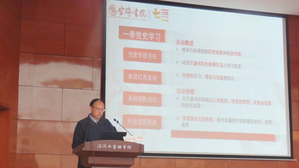 陈阳静结合上级关于党史学习教育的相关文件精神,就宗濂书院落实党史学习教育的方案进行解读。宗濂书院结合《中共西安交通大学委员会党史学习教育工作实施方案》制定党史学习教育方案,具体开展以“七个一”工程为主线,即一季党史学习、一个宣讲团队、一场知识竞赛、一本合著书籍、一座影音书库、、一组红色歌曲、一台党史话剧七个核心项目,开展高质量、多形式、宽范围的党史学习教育工作。他指出,宗濂书院“七个一”工程要打造出一批具有宗濂特色的党史学习资源和形式多样的党史学、教、宣相结合的团队,在努力提升自身党史素养的同时,走出书院,走到广大群众的身边,以实际行动扩大党史学习的成果。
