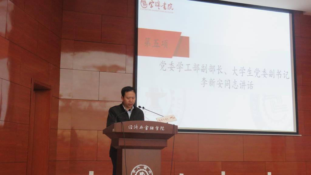 4月21日,宗濂书院党史学习教育动员大会暨“七个一”工程启动仪式在雁塔校区财经主楼东配三教室召开。学校大学生党委副书记李新安,团委书记苏翔,法医学院党委副书记、宣讲团指导老师陈晨,马克思主义学院副院长马忠,宗濂书院党总支书记、院务副主任陈阳静,宗濂书院党总支秘书梁俊凤,宗濂书院团工委副书记曹景强以及宗濂书院辅导员出席会议,宗濂书院党团学学生骨干参会。宗濂书院院务副主任陈勇主持会议。