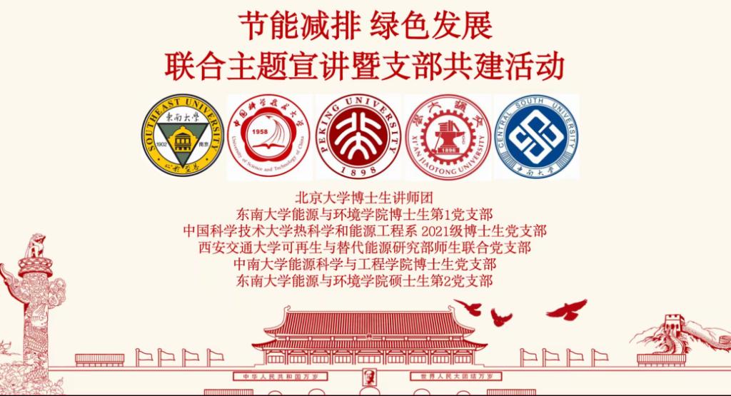 为进一步推进我国生态文明建设,同时依托“三会一课”、主题党日,组织党员开展好理论学习,发挥支部引领作用,实现党团共建、班级共建。3月29日上午,西安交大可再生与替代能源研究部师生联合党支部联合北京大学博士生讲师团、东南大学能源与环境学院博士生第1党支部、东南大学能源与环境学院硕士第2党支部、中国科学技术大学热科学和能源工程系2021级博士生党支部及中南大学能源科学与工程学院博士生党支部举办《节能减排绿色发展》主题宣讲活动。活动由东南大学能环学院王吴玉主持,共建党支部全体党、团、班成员参加。