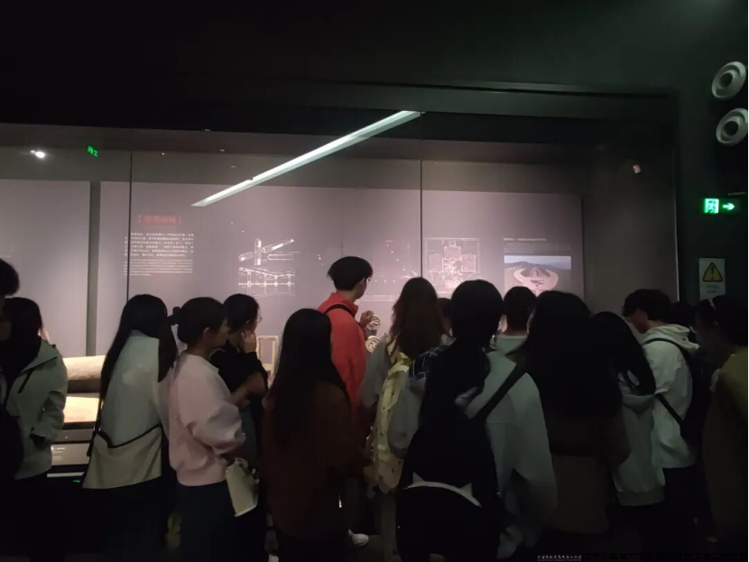 24级研究生陈俊彤同学担任本次实践的现场讲解员。他结合前期扎实的资料准备,从历史、艺术与旅游管理多维视角,为同学们生动解读了重点文物的文化内涵与展陈设计思路。同时,他特别引导大家关注文物背后的技术呈现方式,例如数字展板如何增强信息可读性、多媒体手段如何提升叙事感染力,启发同学们从“管理”角度重新审视博物馆的运营逻辑。