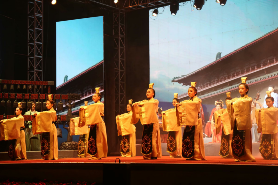 西安外事古乐团“钟鸣鼓乐”演出在继承世界非物质文化遗产“西安鼓乐”核心特质的同时,从立意、编曲、造型、舞美等方面进行大胆创新,古为今用、推陈出新,让“非遗”“活起来”。