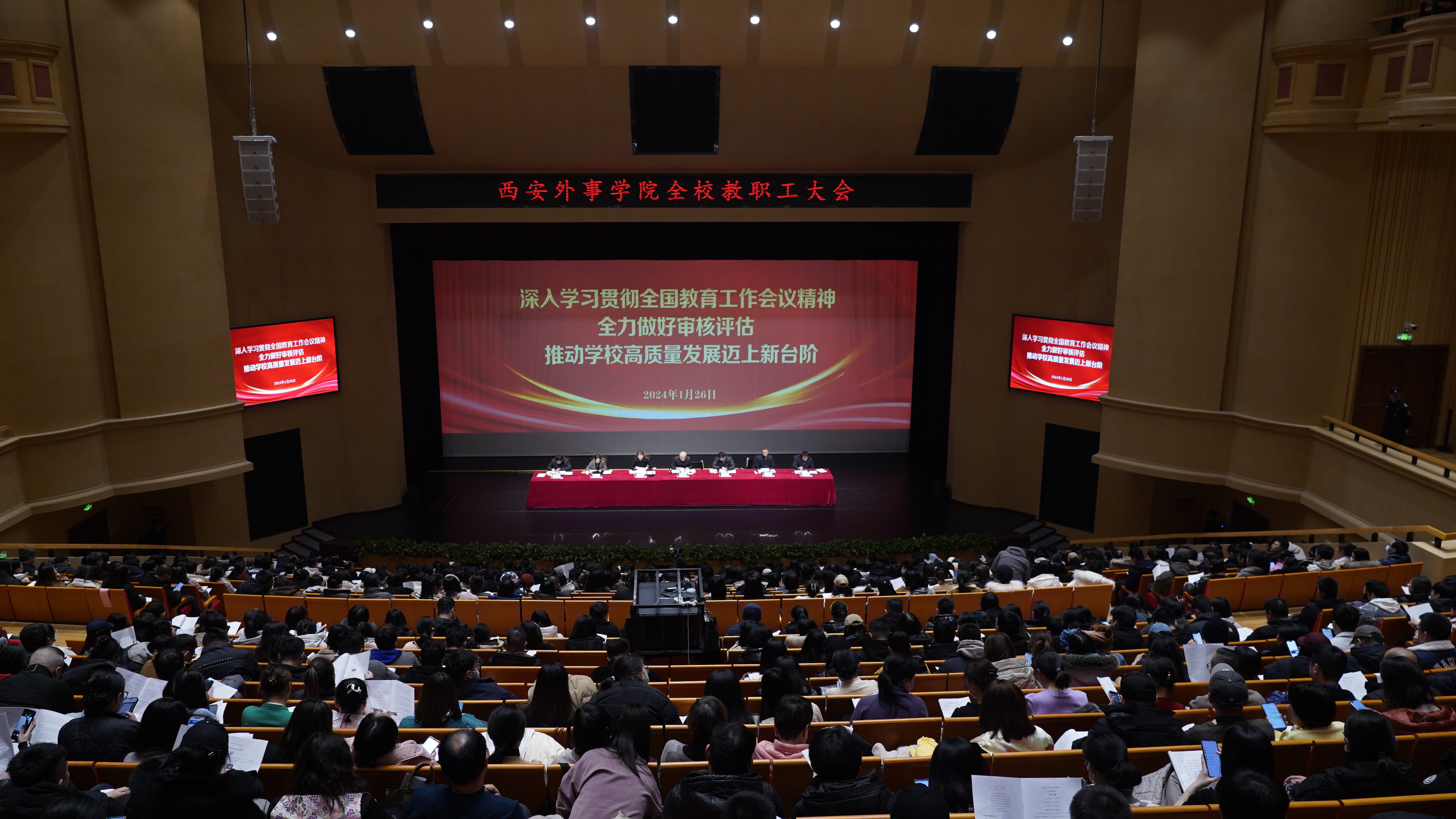 2024年1月26日,西安外事学院教职工大会在西安鼓乐大剧院召开。大会以“深入学习贯彻全国教育工作会议精神 全力做好审核评估 推动学校高质量发展迈上新台阶”为主题,对2024年学校工作进行了谋划部署。学校理事长、校长黄藤出席大会并作重要讲话,理事长助理、校长助理黄昶力主持会议,国际事务负责人戴奇志及监事会领导、各工作部部长参加会议。
