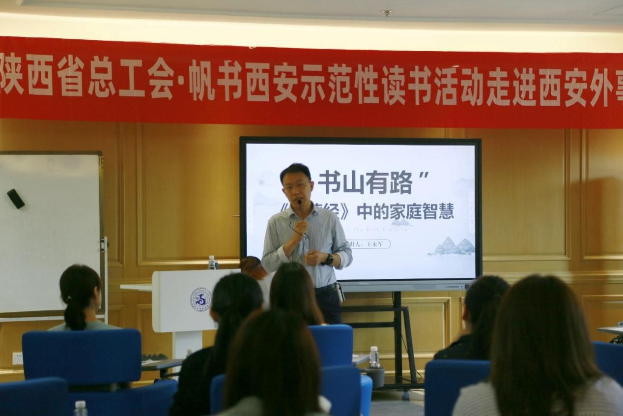 西安外事学院工会邀请帆书(原樊登读书会)西安运营中心主任、陕西广播电视台栏目嘉宾王永军老师作为主讲人与职工分享“《道德经》中的家庭智慧”。来自各分会的50余名教职工参加了本次职工读书会。