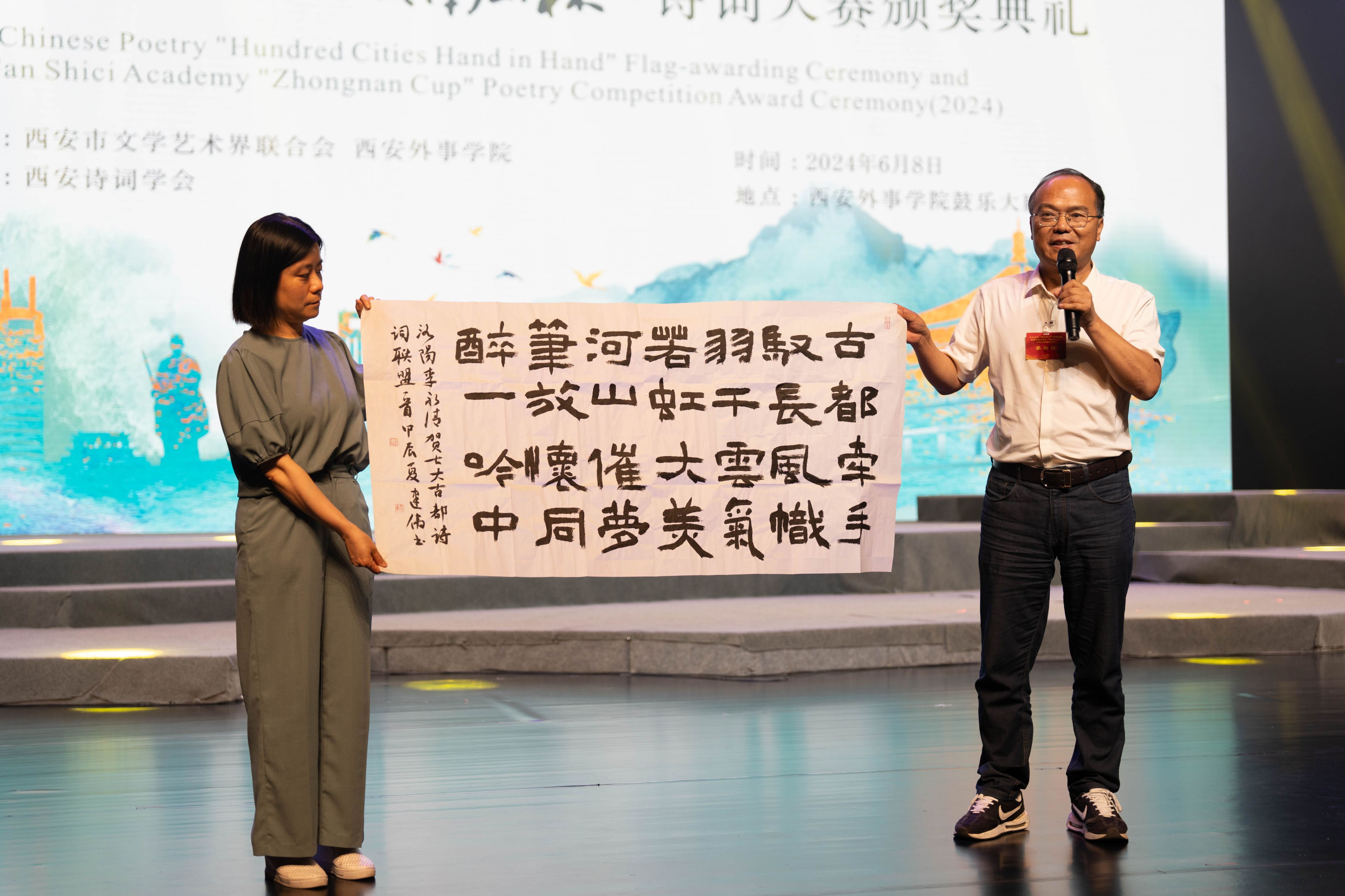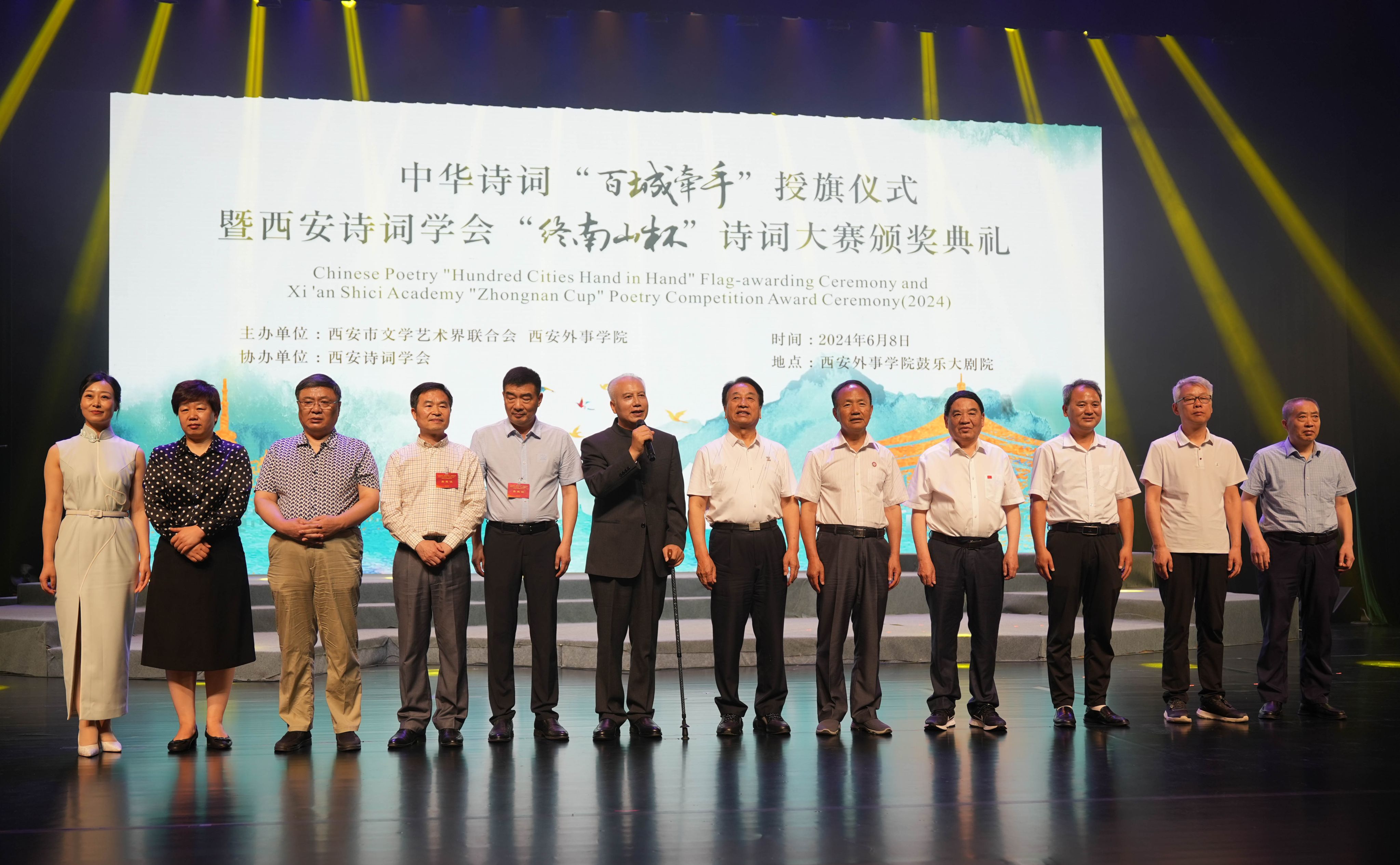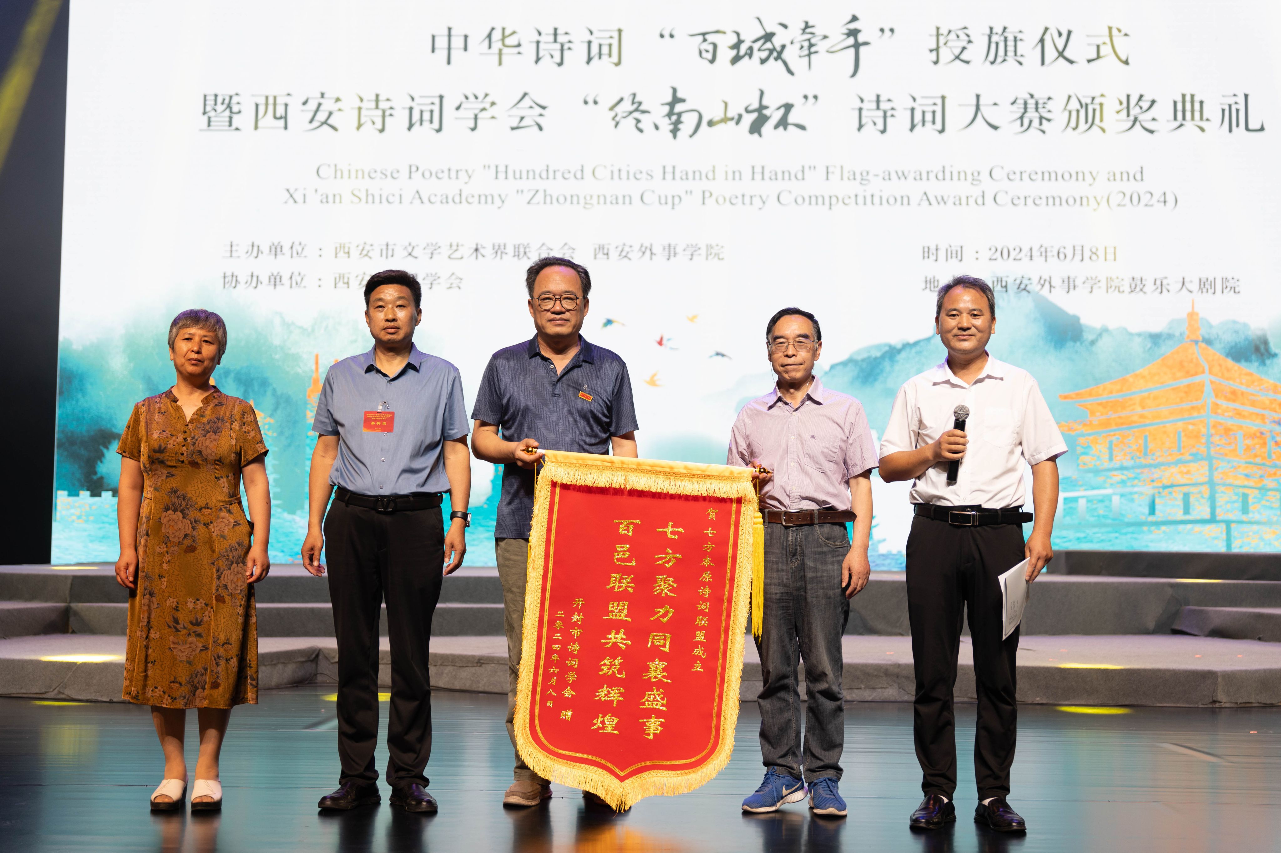 当日,中华诗词“百城牵手”授旗仪式暨西安诗词学会“终南山杯”诗词征文大赛颁奖典礼在西安鼓乐大剧院隆重举行。典礼仪式上,长安诗社及《长安诗刊》创建人,西安外事学院理事长、校长黄藤代表活动主办方宣布“中华诗词‘百城牵手’七大古都联盟”正式启动。西安诗词学会、南京诗词学会、杭州市诗词楹联学会、洛阳诗词学会、开封市诗词学会、安阳市诗词学会等中国古都诗词学会代表登台共同见证了历史一刻。