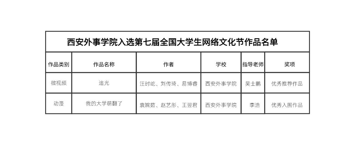 日前,由教育部思想政治工作司、中央网信办网络社会工作局联合举办的第七届全国大学生网络文化节和全国高校网络教育优秀作品推选展示活动评选结果揭晓,西安外事学院共2件作品入选,获优秀推荐作品奖1项、优秀入围作品奖1项。