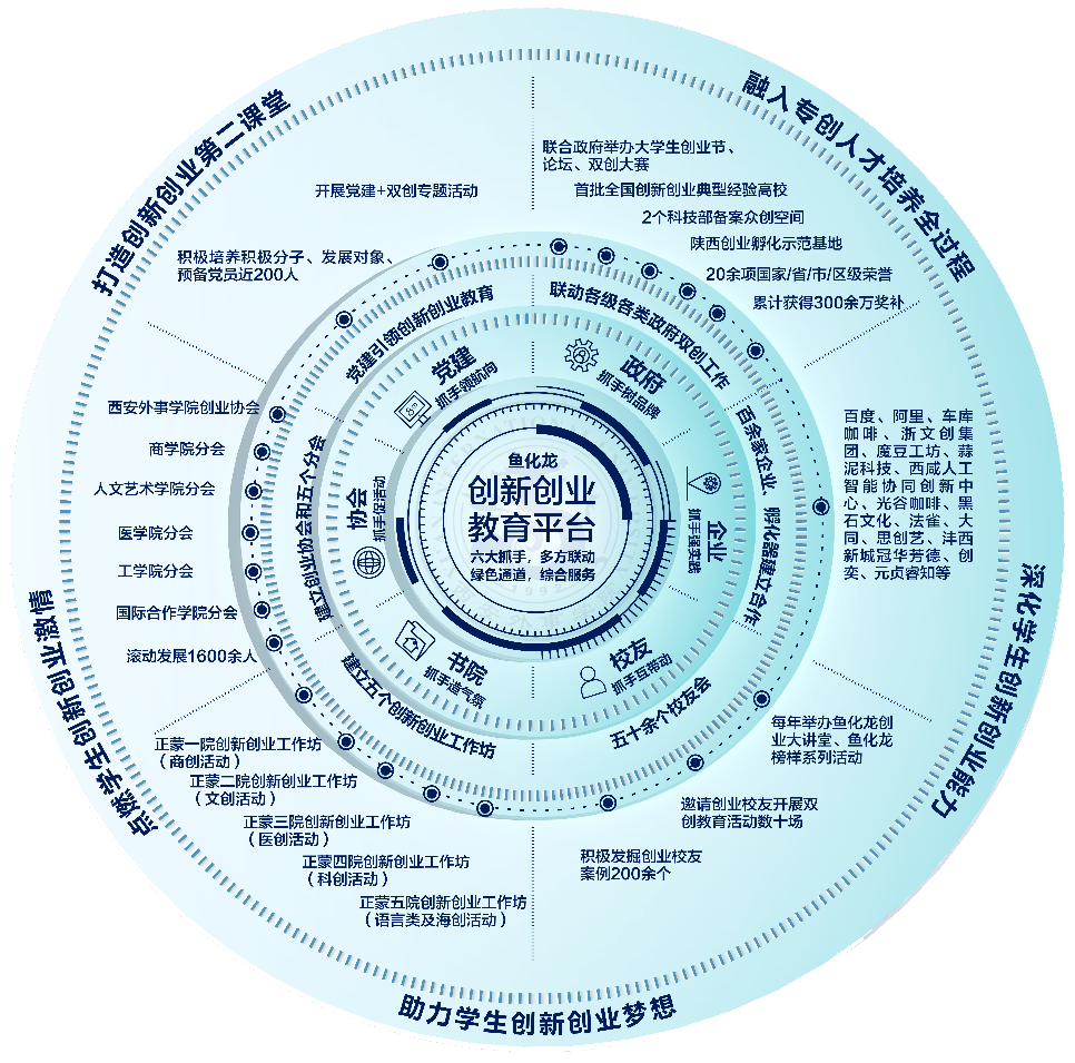 近年来,西安外事学院坚持以习近平新时代中国特色社会主义思想为指导,坚持为党育人、为国育才,全面贯彻党的教育方针,紧密围绕立德树人的根本任务,整合和有效发挥各方创新创业资源与力量,建成了功能完善、独具特色的“鱼化龙” 创新创业教育平台,开展了以培育力、服务力、资源力、影响力、创新力五力并举的双创育人新模式,以高质量推动学校双创教育高速发展。