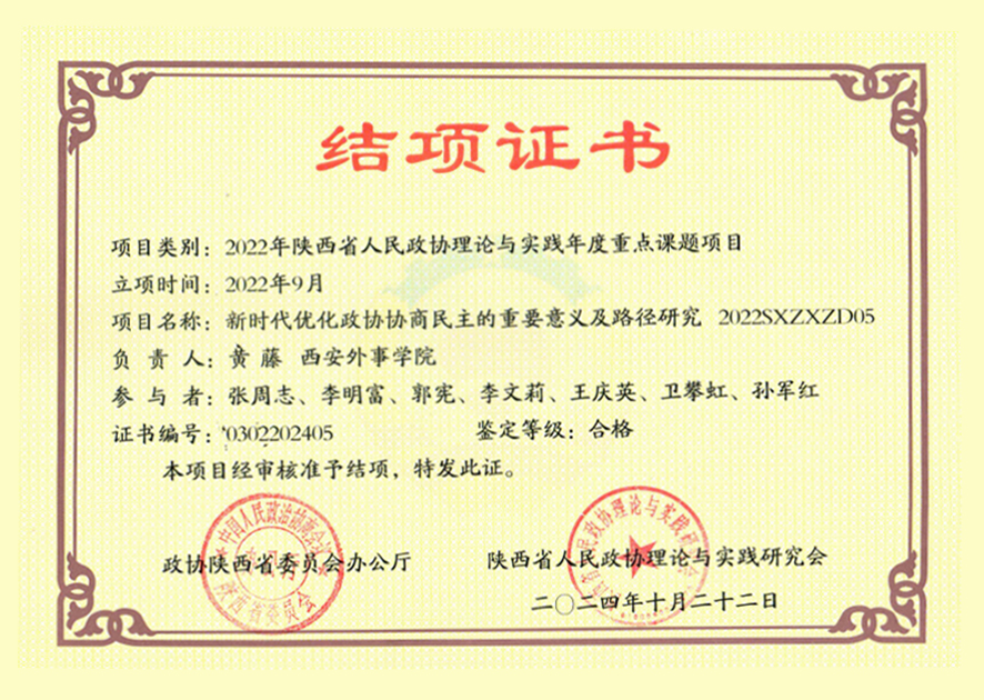 近日,由西安外事学院理事长、校长黄藤主持,马克思主义学院教师、七方教育研究院教师共同参与的2022年陕西省人民政协理论与实践年度重点课题项目《新时代优化政协协商民主的重要意义及路径研究》顺利结项。学校这一课题也是陕西省高校中唯一一所民办高校入选2022年陕西省人民政协理论与实践年度重点课题项目。