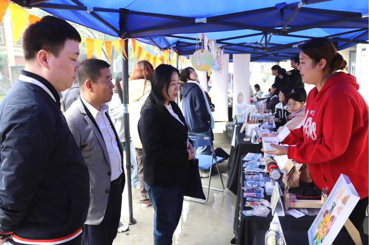 创客市集活动现场,西安市就业服务中心王芬娟科长、任骐慈也莅临指导,深入校园为创客市集的学生提供咨询与帮扶服务,帮助他们了解创业政策、就业机会和技能培训,支持他们实现创新创业梦想,推动大学生的职业发展与就业能力提升。他们对市集活动表示高度赞赏,认为此活动不仅为学生提供了展示创新成果的平台,也促进了大学生的就业与创业能力的提升。他们强调,学校与社会的合作能够更好地为学生提供就业指导和创业支持,帮助他们在未来的职业道路上取得成功。同时在活动期间,参观了学校“鱼化龙”众创空间,这里为学生提供了一个开放、合作的环境。在参观过程中,他们与学生亲切交流,鼓励学生积极探索自己的创业梦想,并分享了职场发展与创业过程中的经验与建议,增强了学生对未来职业规划的信心。