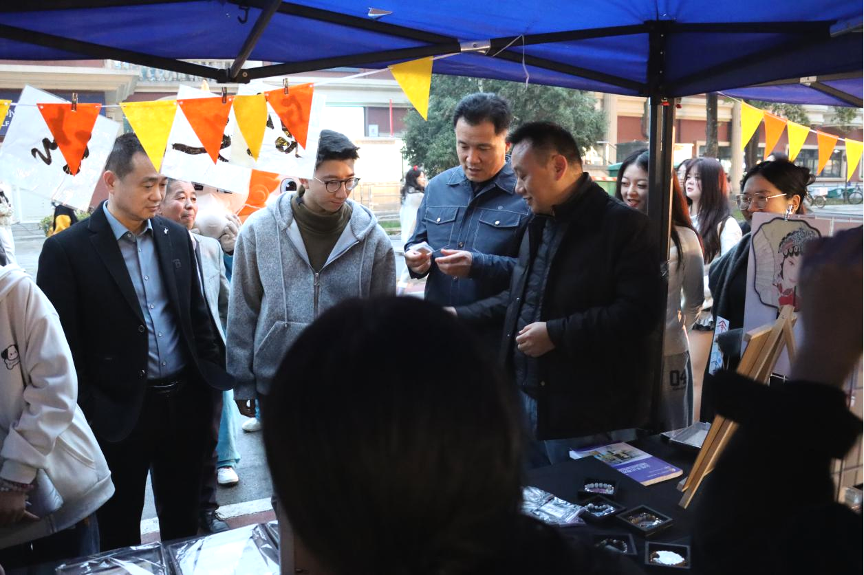 市集现场人潮涌动,各个摊位前围满了对创意产品充满好奇的同学们。年轻的创客们热情向来宾介绍他们的作品,分享创作过程中的灵感与故事。除了产品展示,市集还安排了丰富多彩的互动环节,参与者可以通过现场集印章打卡活动,亲手制作属于自己的漆扇,感受创作的乐趣。
