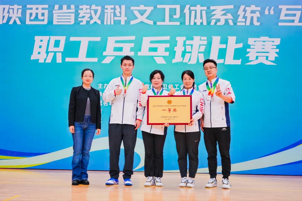 陕西省教科文卫体工会副主席夏明文(左一)为获得冠军的单位颁奖