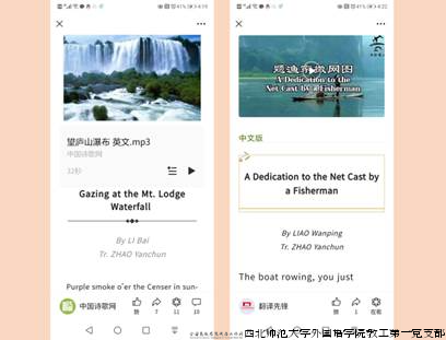 2020年1月以来,西北师范大学外国语学院教工第一党支部书记吕文澎副教授担任“译典”组稿编辑。在主编的指导下,吕文澎带领研究生参加“译典”译诗、朗诵、诗人简介翻译等活动,先后完成900多期的组稿工作,并同步转发、推送“翻译先锋”公众号900多期,为双语诗歌艺术的国际传播做出了积极贡献。