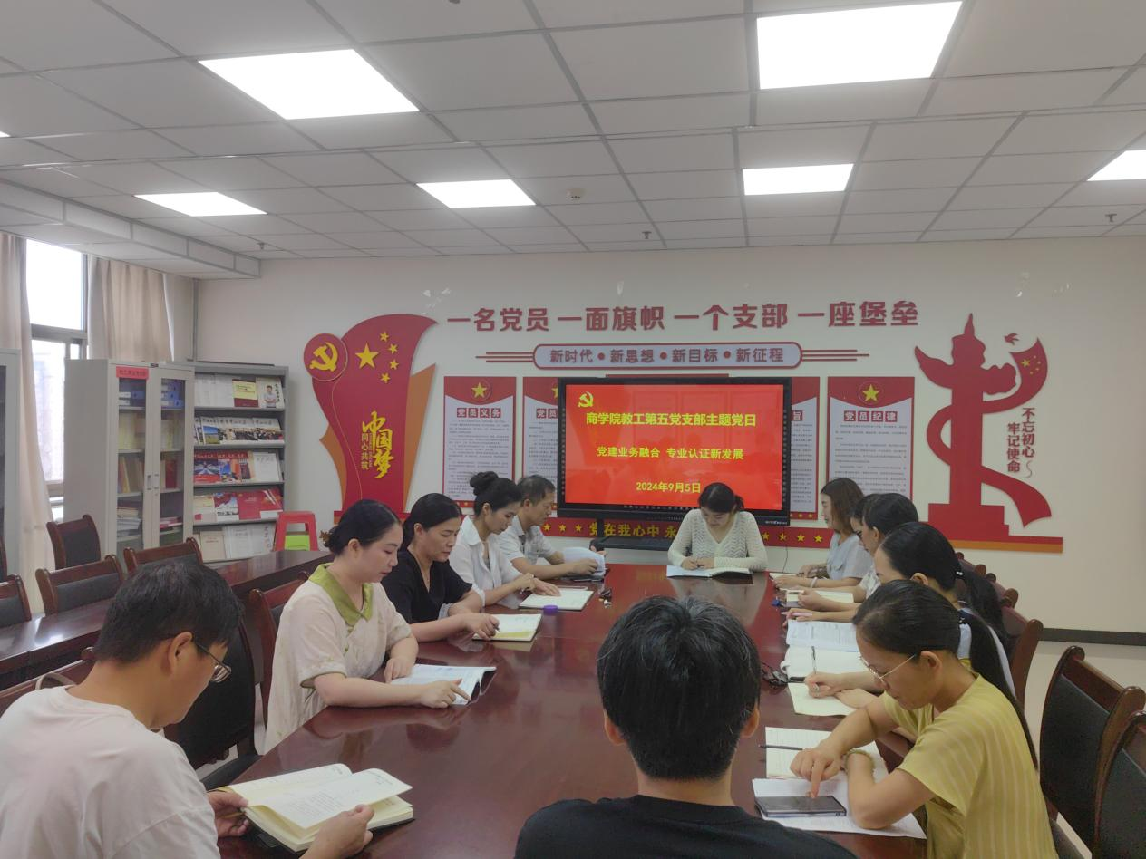 9月5日,许昌学院商学院教工教工第五党支部在1325党员活动室召开“党建业务深度融合,专业认证新发展”主题党日活动,活动由支部书记刘霞主持,支部全体党员参加。