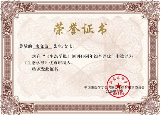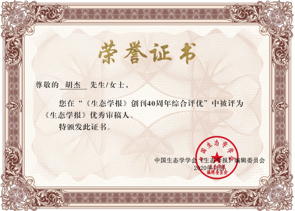 值此《生态学报》创刊40周年之际,《生态学报》对刊发文章学术研究传播成果进行了总结,同时也对本刊审者进行了深度挖掘,对近5年为学报审稿工作做出突出贡献的评审人进行了评优,本次共评选出600人,我院胡杰教授和廖文波研究员在“《生态学报》创刊40周年综合评优”中获得《生态学报》优秀审稿人荣誉称号。