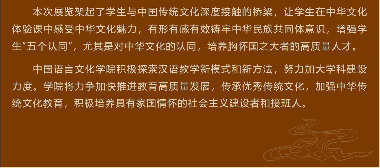 本次展览共设九个主题,分为十个展柜进行展示。其中仿古文物二十余件,类型包括青铜器、陶器、石器、骨器、书画等,希望观展学生可以通过这些展品,了解汉字的历史、欣赏汉字之美、体验汉字之趣,感受中华文化的源远流长和博大精深。