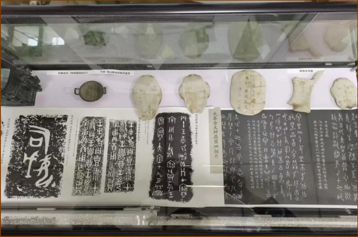 展品:《甲骨文字歌》、先秦-金文《钟鼎器皿拓片》、先秦-金文《毛公鼎全形拓片》、散氏盘笔掭、仿四羊方尊、仿甲骨文摆件等六余件文物。