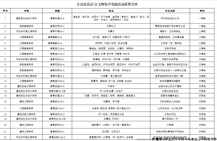 为深入贯彻落实习近平总书记关于“让收藏在博物馆里的文物活起来”的重要指示精神,推动铸牢中华民族共同体意识教育走深走实。近期,由新疆建设职业技术学院主办,马克思主义学院、信息管理学院共同承办,新疆世纪超星有限公司、马克思主义学院星火社、信息管理学院征程社协办的首届“让历史说话,让文物发声”铸牢中华民族共同体意识创意微视频比赛暨思政课实践教学活动圆满落幕。