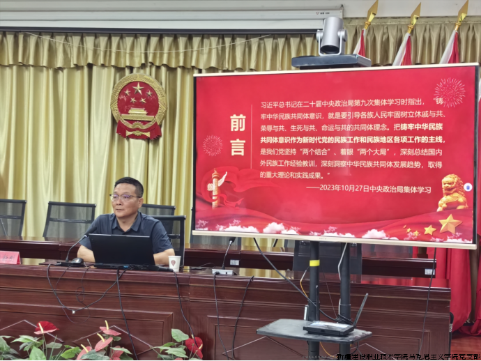 马克思主义学院党支部书记陈新刚围绕铸牢中华民族共同体意识,为当地干部开展了专题宣讲。宣讲中,陈新刚书记结合当前形势和乡村实际,深刻阐述了铸牢中华民族共同体意识的重要性和紧迫性。精彩的宣讲让在场干部深受启发,大家表示将把宣讲内容转化为推动工作的实际行动,为铸牢中华民族共同体意识贡献力量。