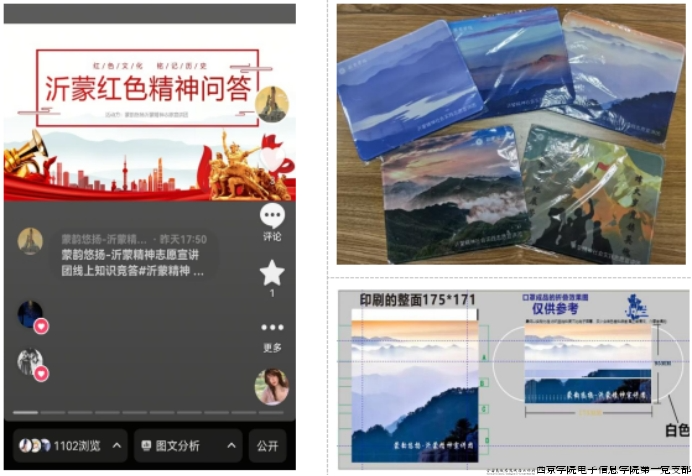 为扩大宣传覆盖面,团队积极探索新媒体与传统宣讲相结合的模式。一方面,团队精心策划2场线上线下知识问答活动,吸引200余人次参与,其中线上活动通过抖音平台直播,浏览量突破1000人次,有效提升了沂蒙精神的传播广度。另一方面,团队充分发挥青年创造力,原创《蒙韵悠扬,沂蒙情长》主题歌曲,以音乐传递红色精神;同时设计制作系列文创产品,包括沂蒙精神主题鼠标垫、口罩、海报等,让红色文化融入日常生活,增强宣传的持久性和渗透力。