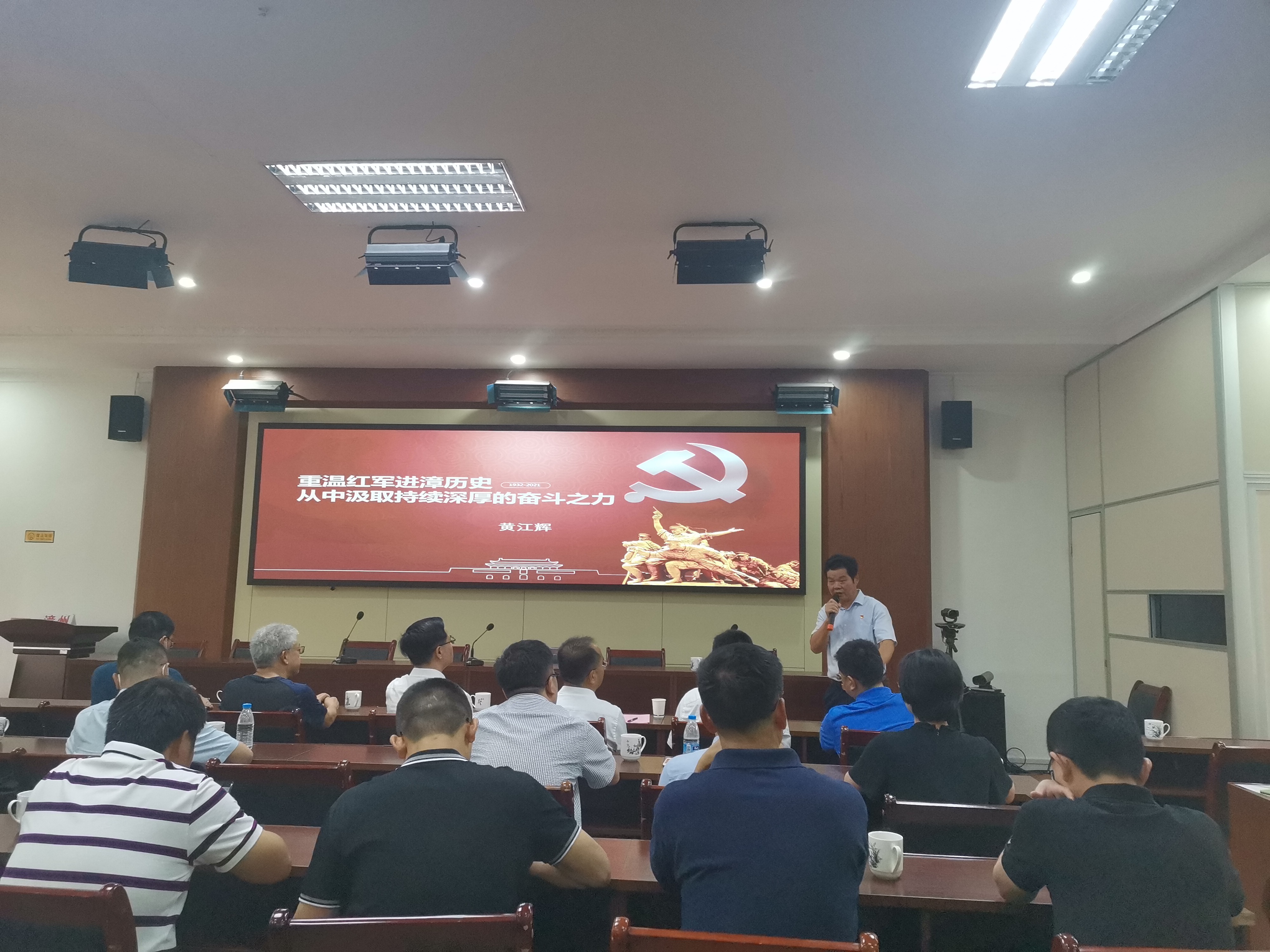 大家在“攻克漳州纪念碑”、毛主席率领红军攻克漳州纪念馆瞻仰学习。纪念馆讲解员介绍了中国工农红军一、五军团组成的东路军从长汀出发,挥师南下,占领龙岩城,在漳州郊区天宝镇经过风霜岭、十字岭等战役的激烈战斗过程。大家在这里认真聆听讲解员的解说,仔细观看陈列在馆内的闽南地区革命活动与红军攻克漳州图片史料、实物资料,以及毛主席当年的工作生活用品,缅怀红军战士们的光辉业绩和卓越功勋。中共漳州市委教育工委书记、漳州市教育局党组书记、局长黄江辉同志以《重温红军进漳历史,从中汲取持续深厚的奋斗之力》为题,为大家讲了一堂专题党课。