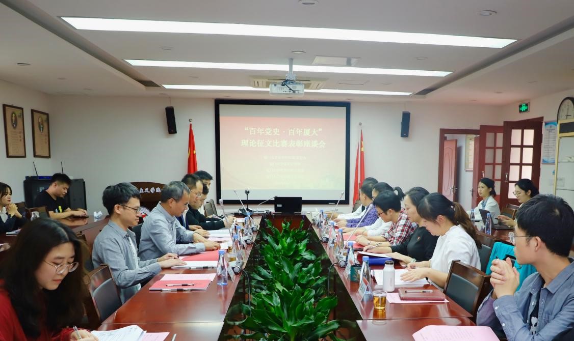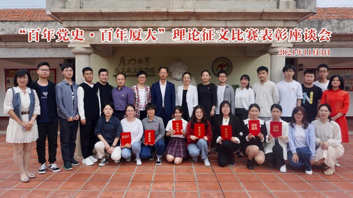 11月3日下午,由厦门大学组织部/党建办、宣传部、学生工作部、马克思主义学院党委共同主办的“百年党史·百年厦大”理论征文比赛表彰座谈会在厦门大学马克思主义学院囊萤楼302会议室隆重举行。