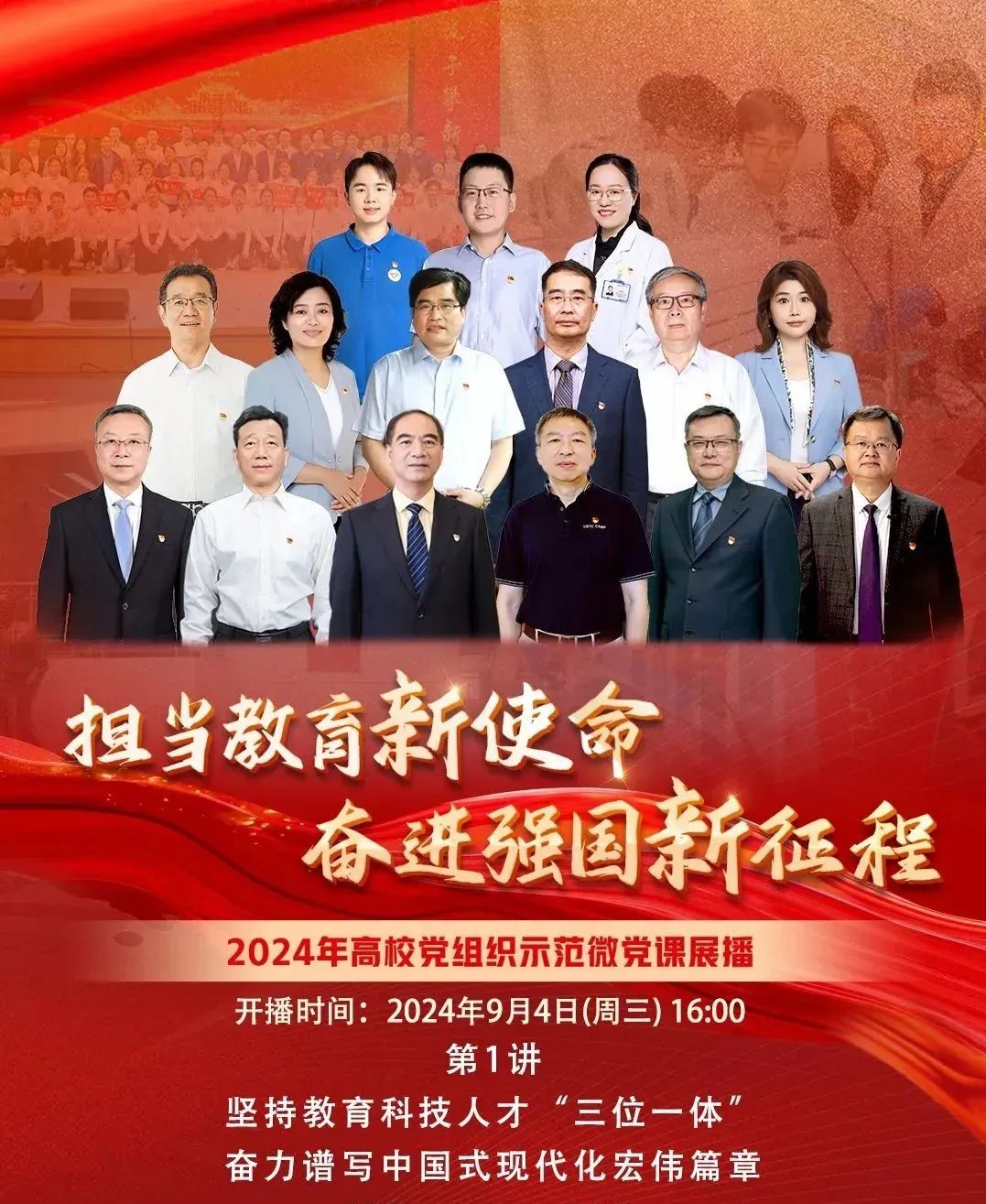 9月4日下午,由教育部思想政治工作司主办,教育部宣传教育中心承办,北京大学、中国科学技术大学、南开大学、厦门大学、山东大学、武汉大学师生党员参与主讲的“担当教育新使命,奋进强国新征程——2024年高校党组织示范微党课展播”第二阶段第一讲《坚持教育科技人才“三位一体”,奋力谱写中国式现代化宏伟篇章》在新华网、光明网、央视网等多家媒体平台直播。