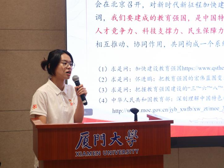 林衍含首先介绍了“扬才开讲了”第七季主题微党课报告会整体工作安排。此次微党课以学习宣传贯彻全国教育大会精神为主线,紧扣教育强国的“六大特质”,以青年视角解读教育系统和厦门大学在推进教育强国建设中的举措和进展。同时结合纪念中国人民抗日战争暨世界反法西斯战争胜利80周年与中共厦大支部成立100周年重要历史节点,在回顾革命历史、传承红色基因的过程中不断深化对教育强国使命的认知,进一步强化青年与国家、与学校发展的情感联结,以更加饱满的热情、更加坚定的信念投身于教育强国建设的伟大实践中。