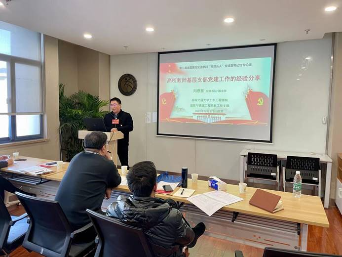支部书记阳恩慧同志,在会上分享了题为“高校教师基层支部党建工作的经验分享”,西南交通大学土木工程学院道路与铁道系教工党支部依托全国样板支部、四川省样板支部建设,围绕为交通强国培养高层次人才为使命,对标七个有力,从援疆援藏系列举措、百年铁道精神传承、服务大国工程、为一带一路培养国际化人才、树典范学先进等系列举措,充分发挥党建工作引领作用。