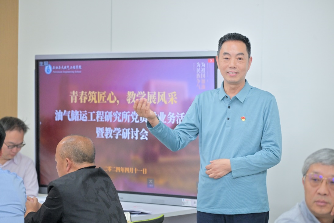 为深入学习贯彻习近平新时代中国特色社会主义思想,增强党员教师的业务素养和教学水平,4月12日下午,油气储运工程研究所党支部在明辨楼C103智慧教室开展以“青春铸匠心,教学展风采”为主题的党员讲业务活动暨教学研讨会。研讨会由支部委员徐涛龙主持,教务处处长廖柯熹,石工院党委书记曾明友、副院长卞小强、教学名师陈小榆、马国光、肖东应邀参会。