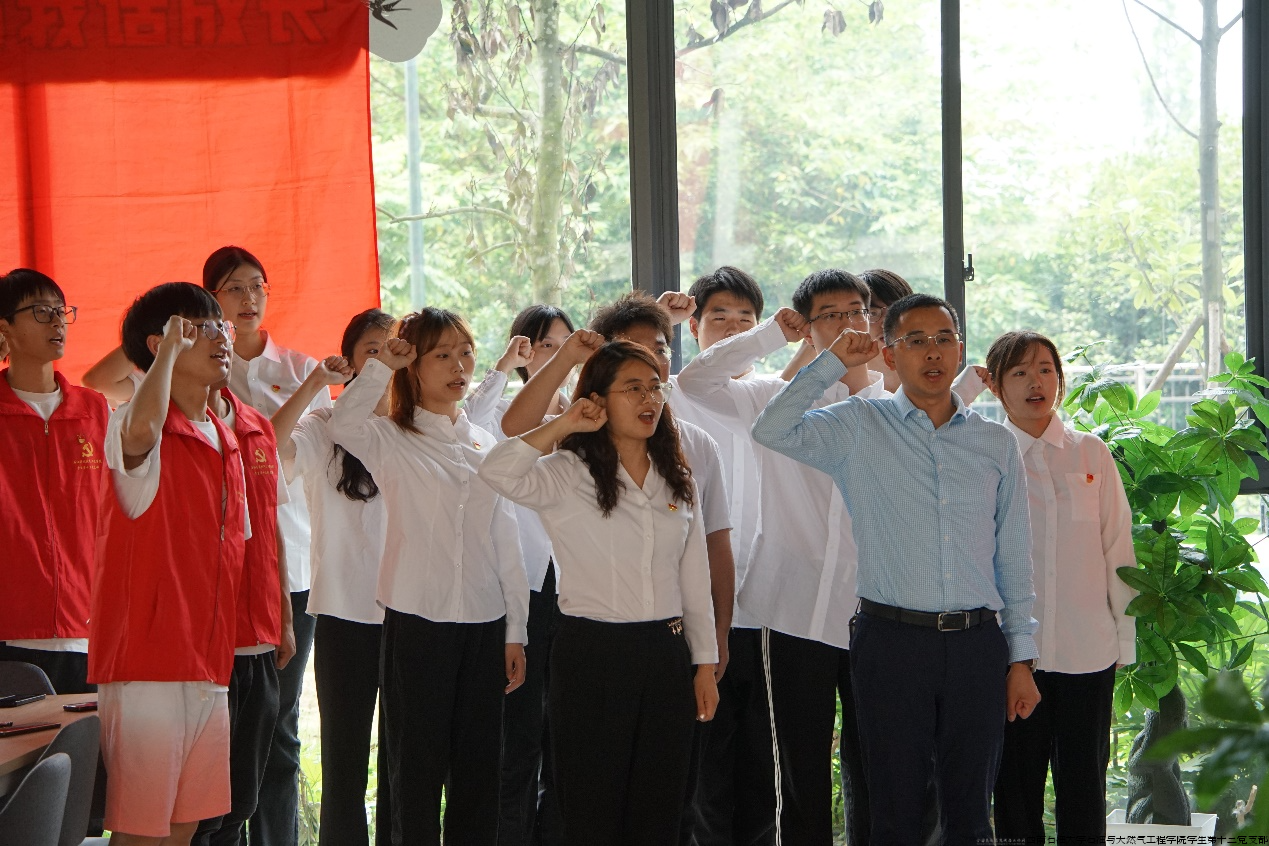 “我志愿加入中国共产党,拥护党的纲领,遵守党的章程……为共产主义奋斗终身,随时准备为党和人民牺牲一切,永不叛党。”在石工院党委副书记钱广的带领下,新老党员高举右拳、面对党旗庄严宣誓,誓词简短却铿锵有力,彰显着入党初心。
