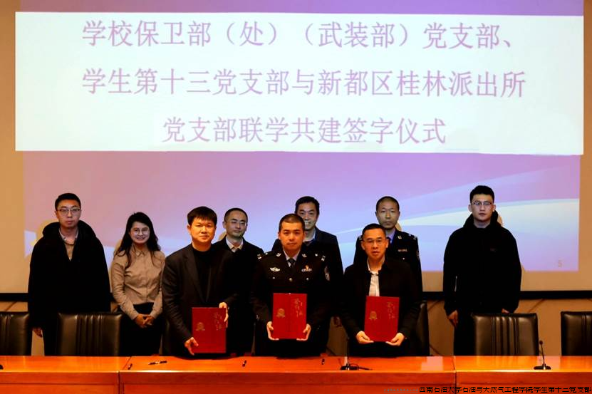 为深化警校合作,筑牢校园安全防线。3月13日,石工院学生第十三党支部与新都区桂林派出所党支部在思学楼A114报告厅举行警校合作共建仪式暨校园安全专题讲座。新都区桂林派出所所长秦晋繁、民警范林,学校党委学生工作处(部)部长张浩,学校党委保卫部(人民武装部)部长蒲冠洲,石工院党委书记曾明友等领导、老师及学生代表齐聚一堂,共同为校园安全建设出谋划策,讲座由石工院党委副书记、纪委书记钱广主持。